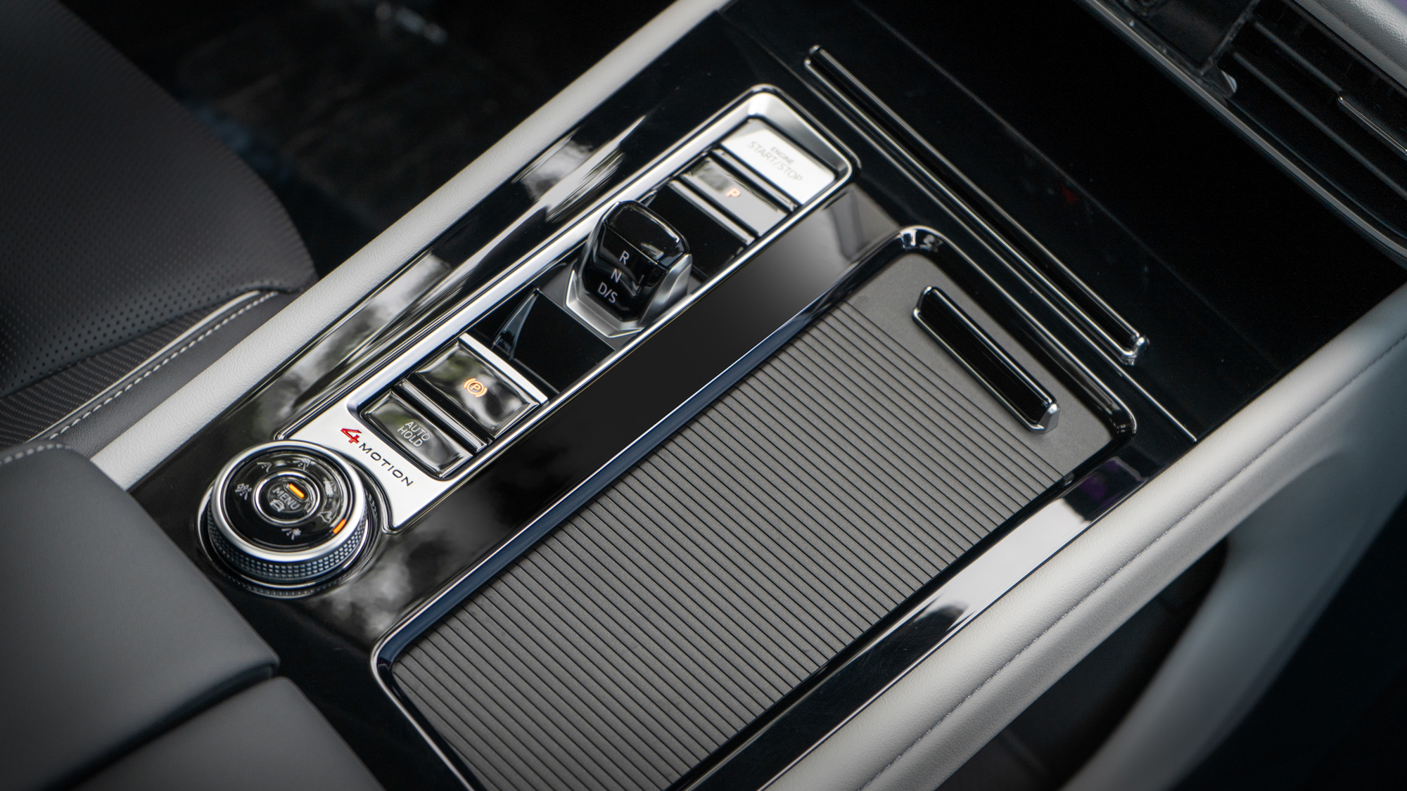 Khu vực điều khiển trung tâm thiết kế lớn với công tắc chuyển số điện tử nhỏ gọn và sang trọng, nút khởi động start/stop thiết kế thuận tiện trong tầm tay.